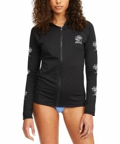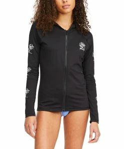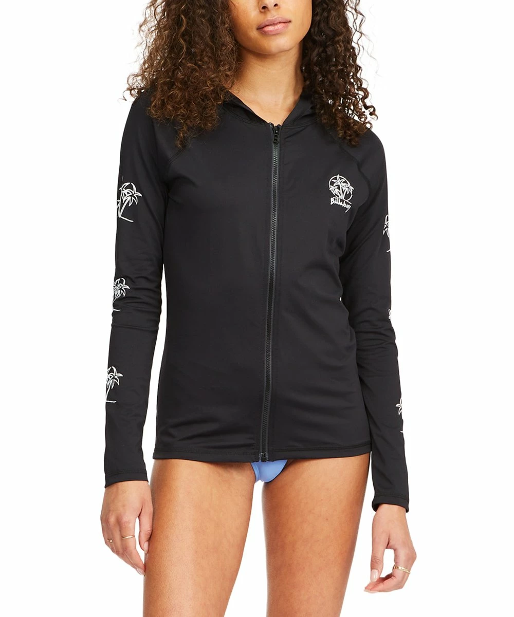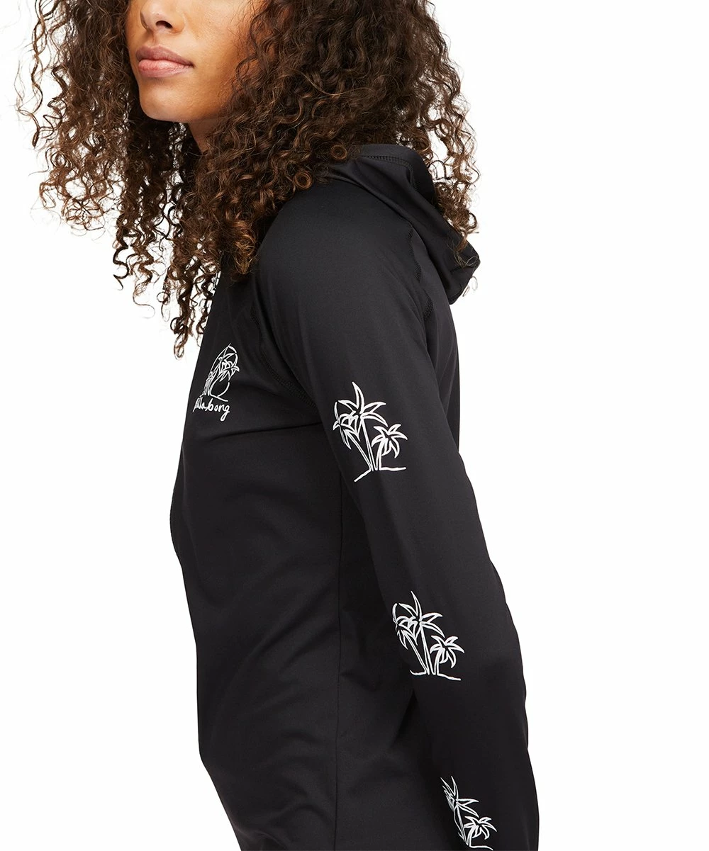 Hit the water and enjoy the comfortable fit of this long-sleeve rashguard featuring graphic-adorned sleeves and a convenient hood.