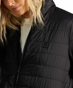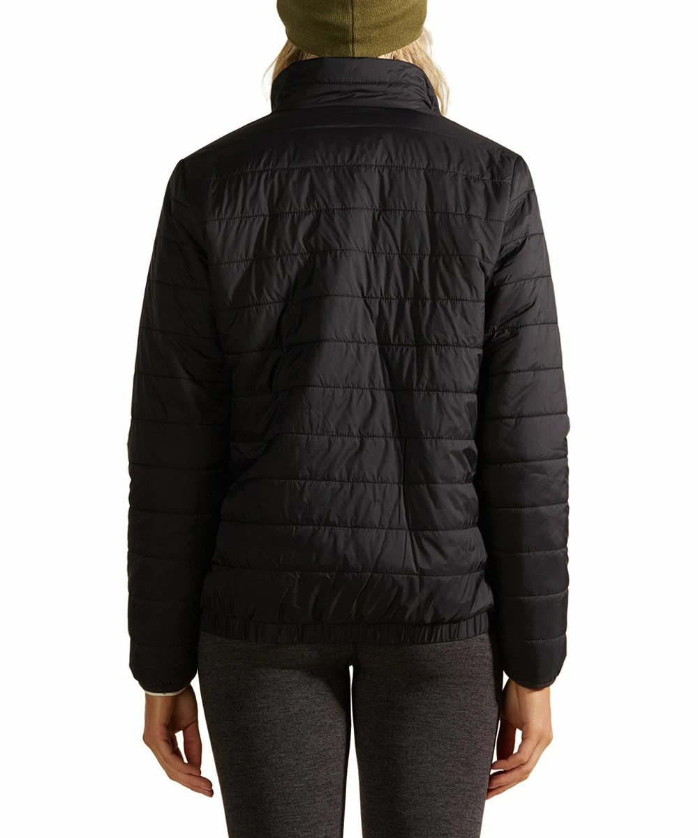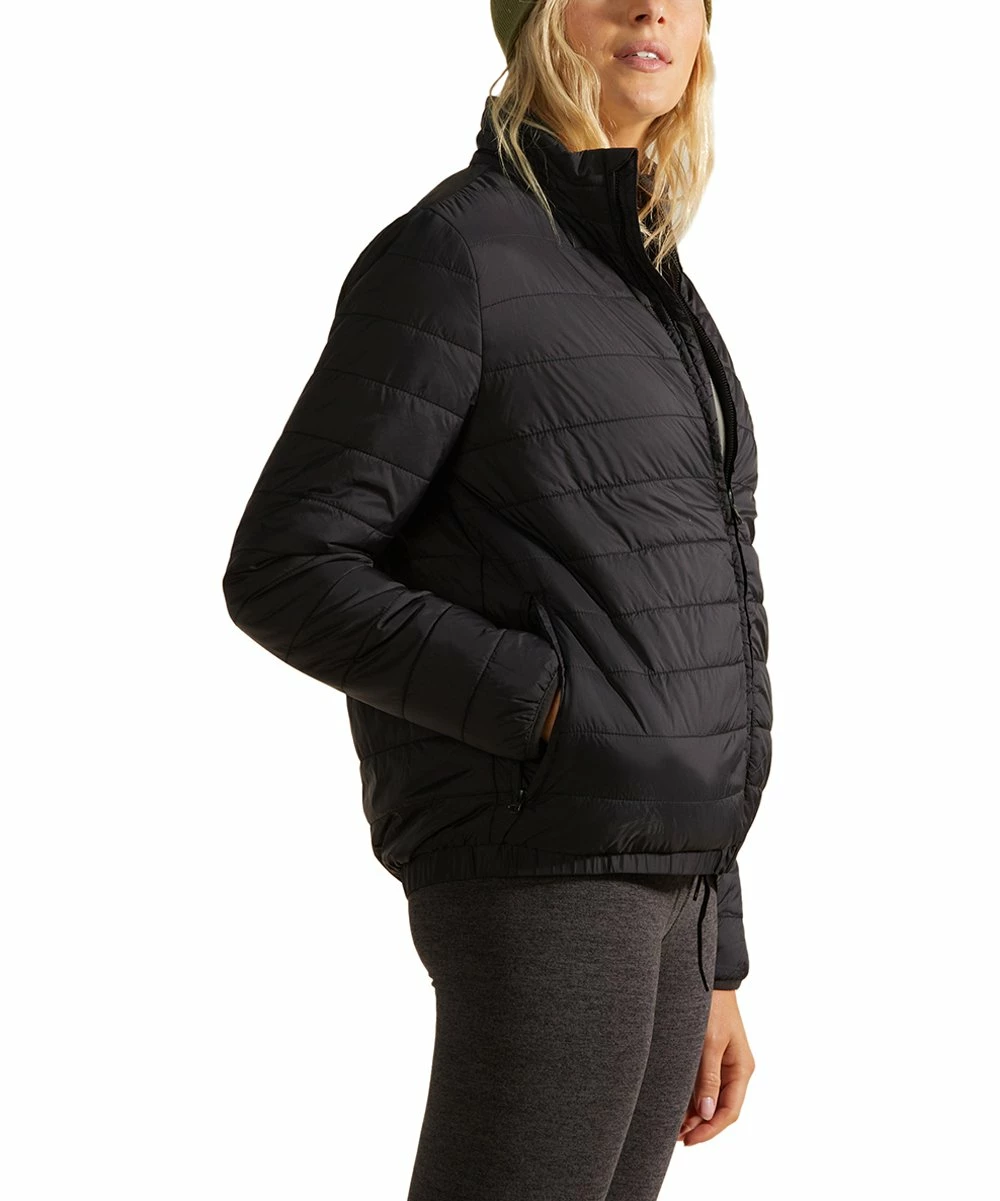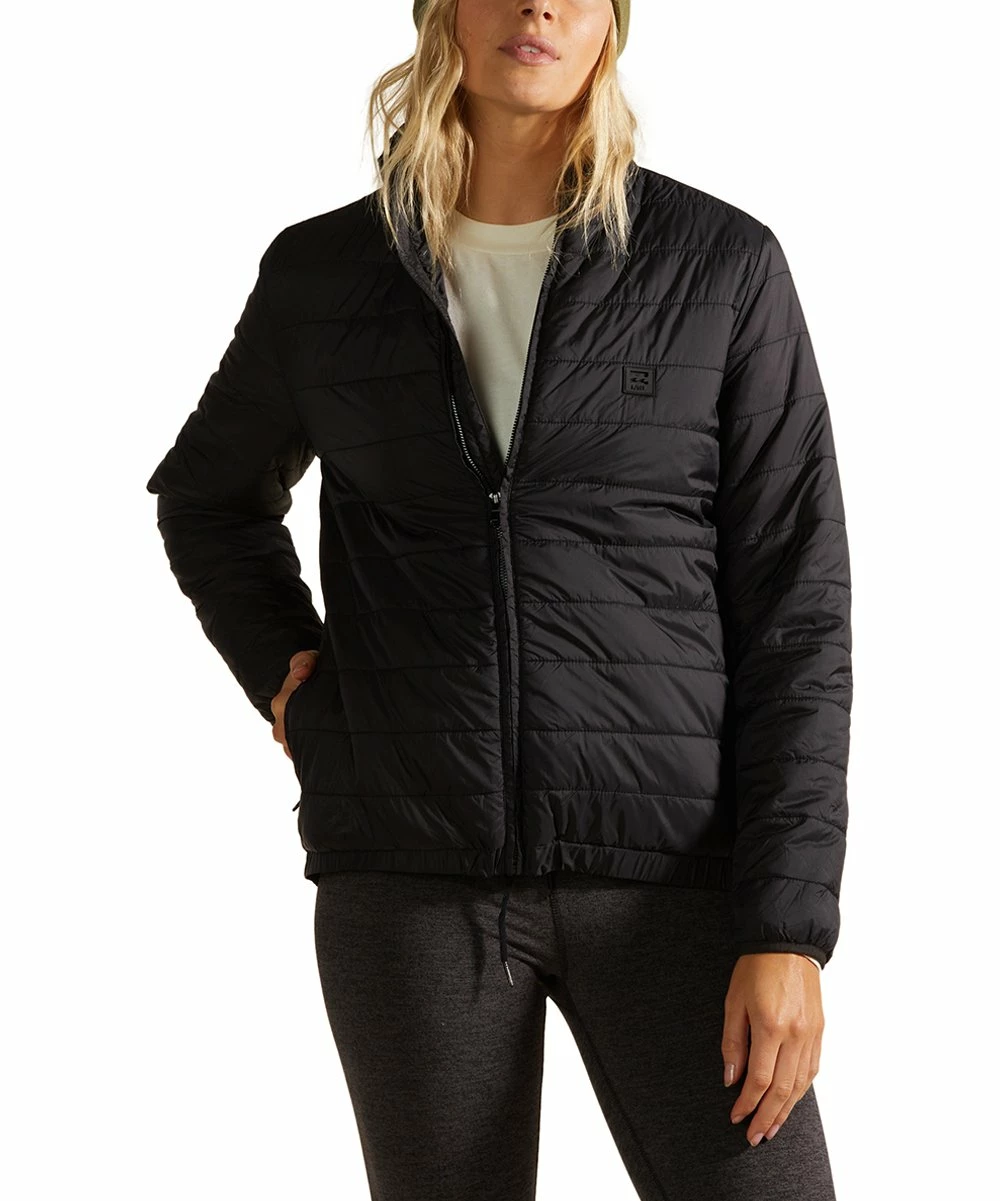 Stay comfortable and warm on chilly days with this puffer-style jacket featuring a full zip front and a pair of convenient side pockets.