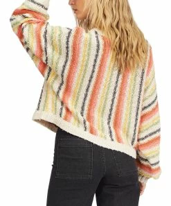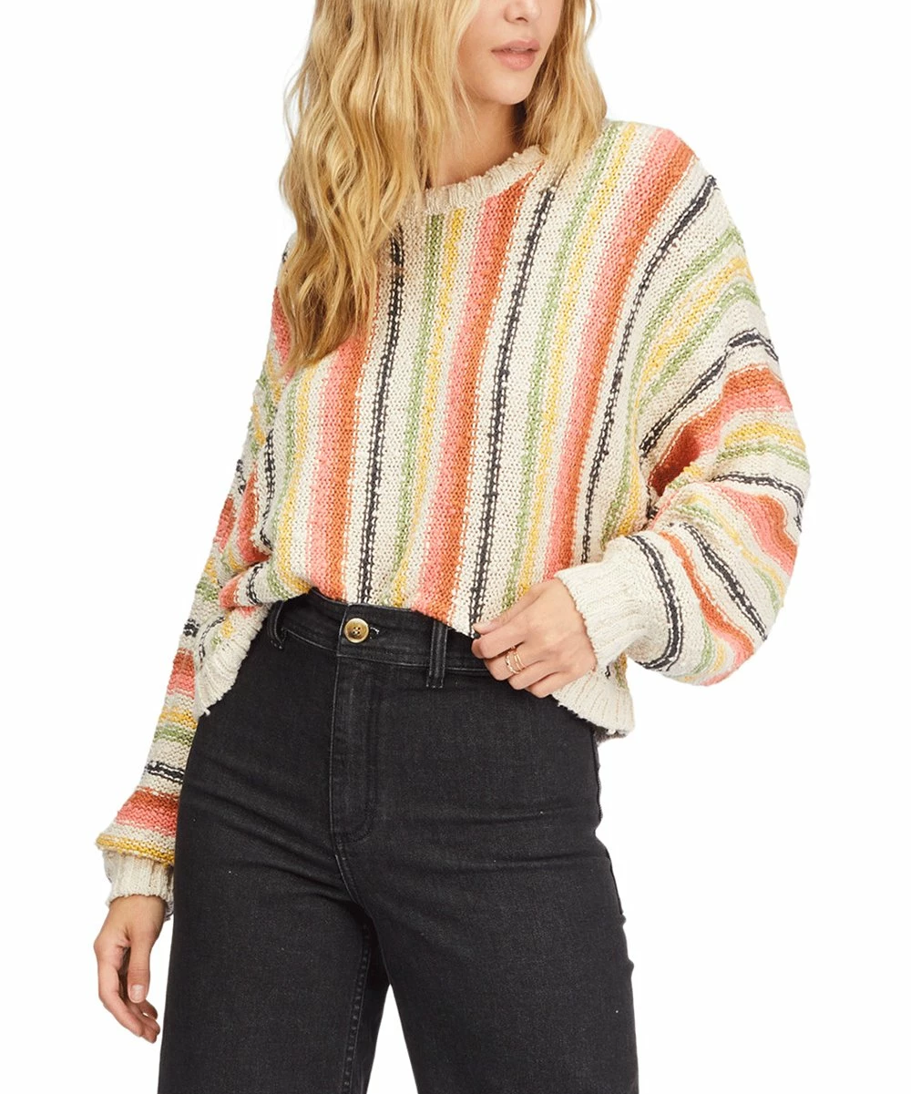 This casual sweater features a relaxed-fit silhouette and a colorful stripe pattern.