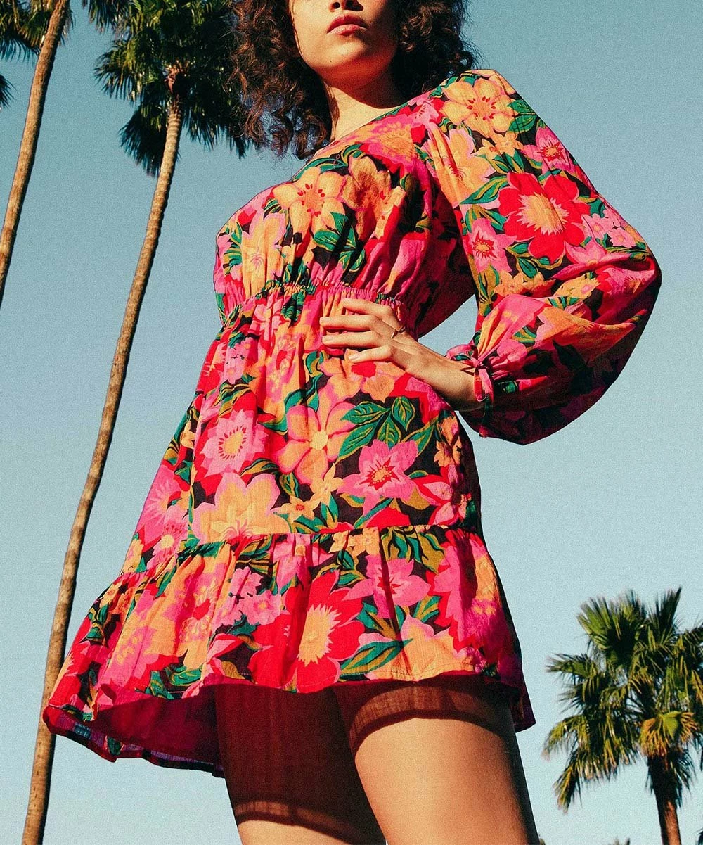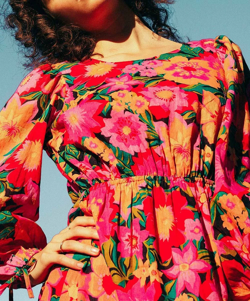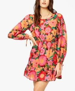 Show off your style in the bold print of this A-line dress featuring a flirty ruffle hem and delicate sleeve ties.