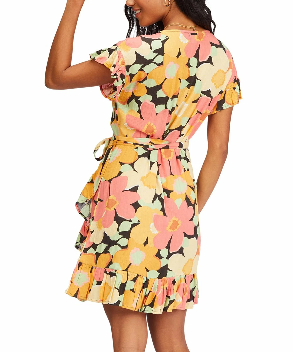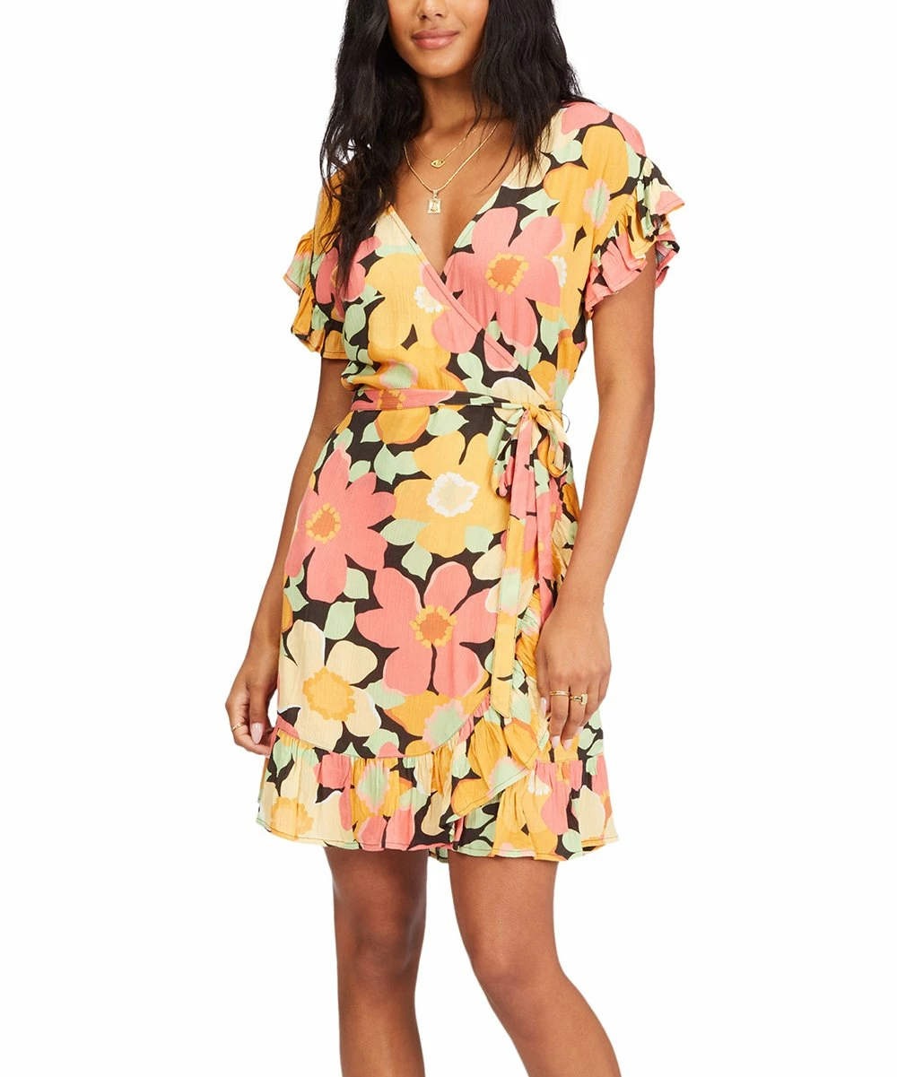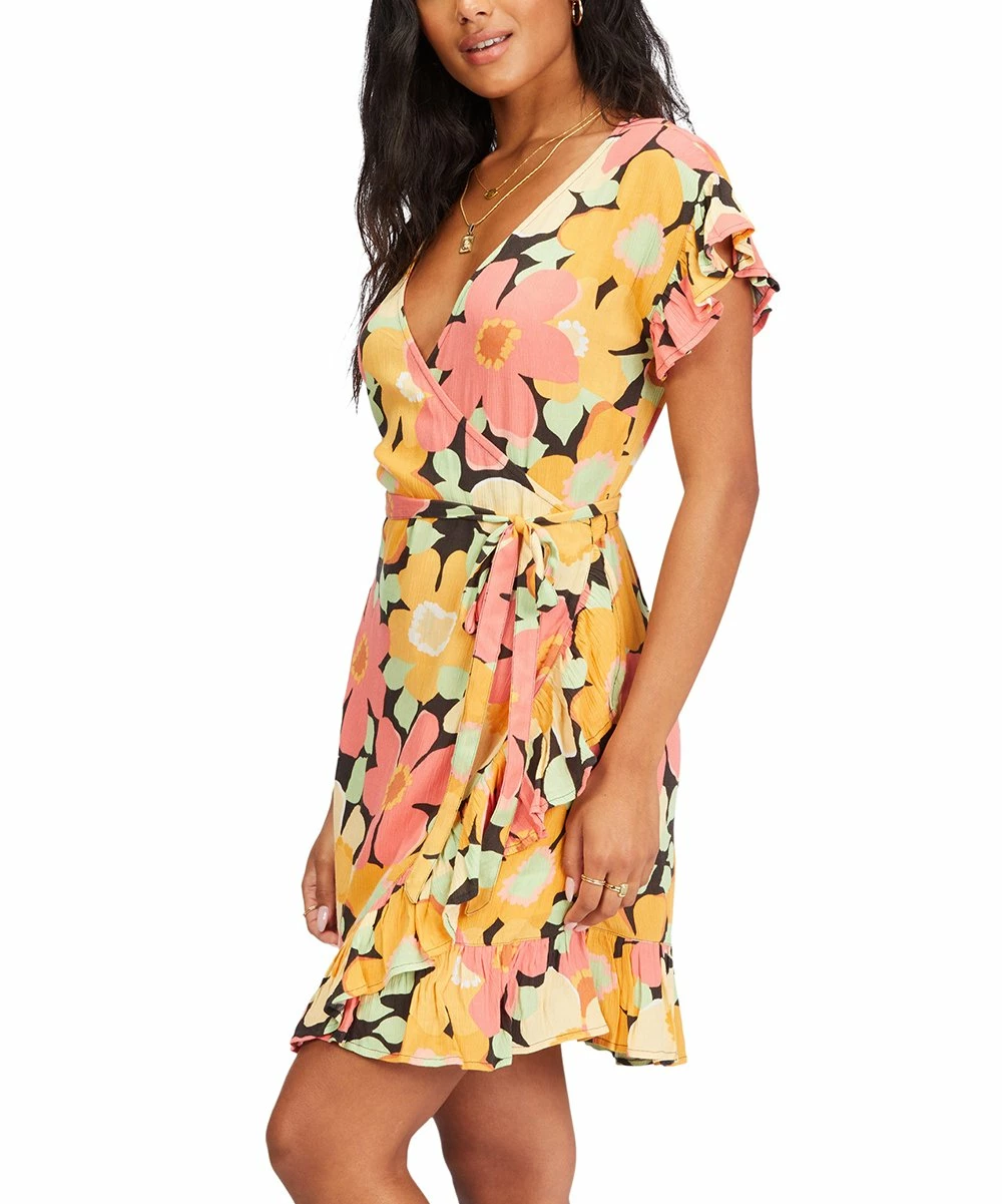 Flowy wrap dress with a flattering V-neckline and playful ruffle sleeves.