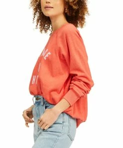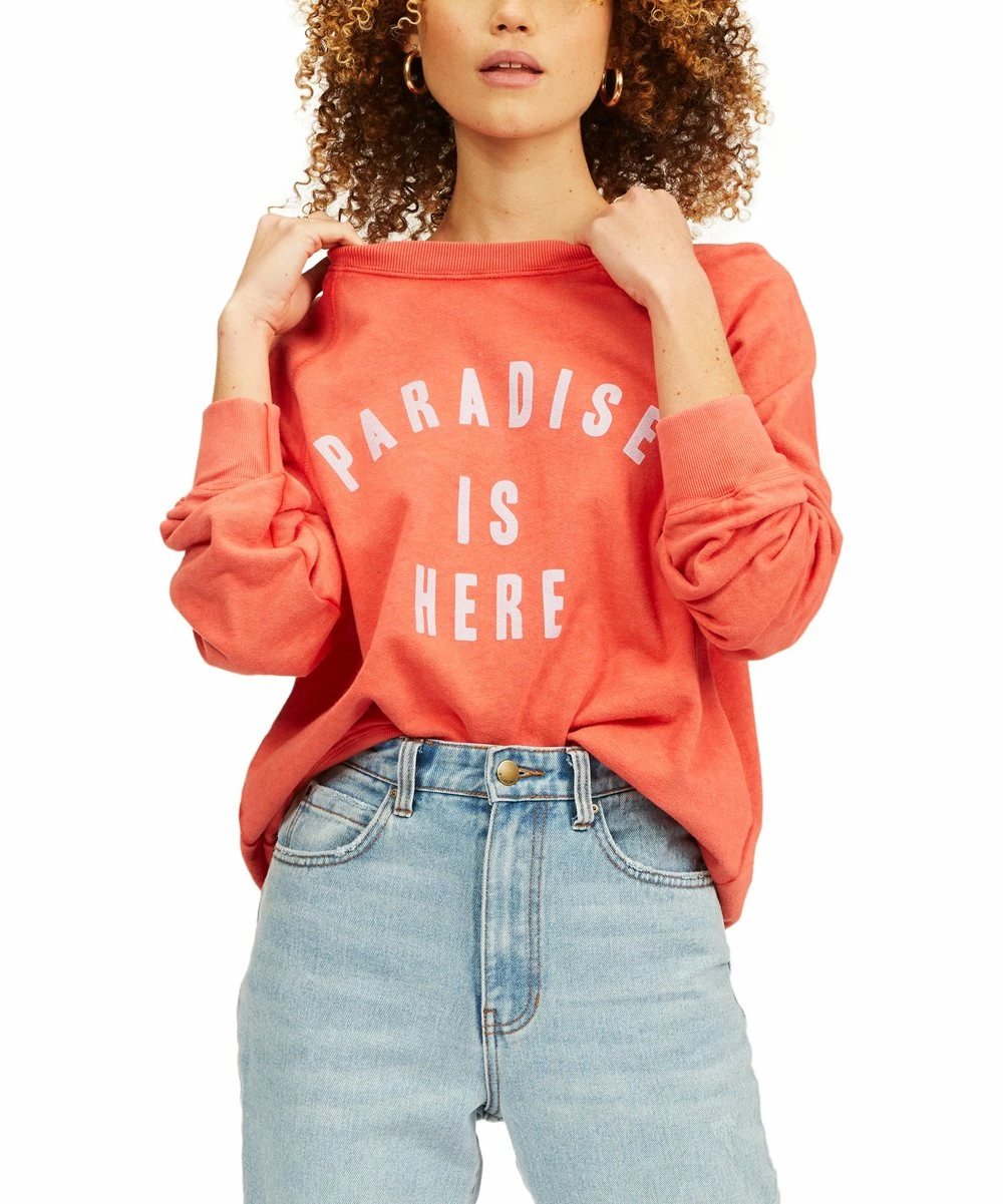Chill out in bright and comfortable style with this lightweight sweatshirt featuring a cotton-blend fabric and a laid-back message.
