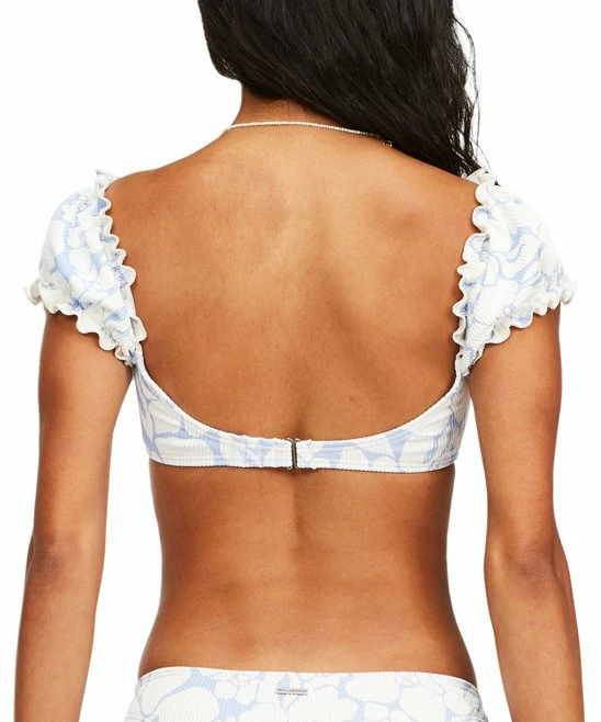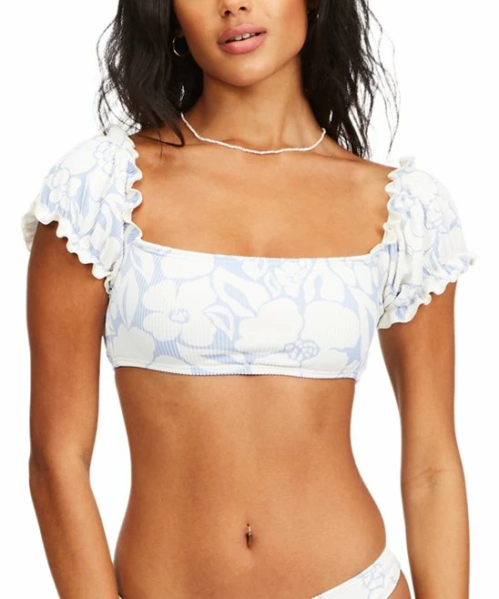 Add a unique flourish to your swimwear collection with this print-adorned bikini top featuring short puff sleeves.