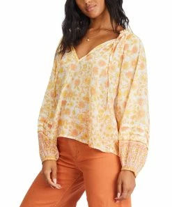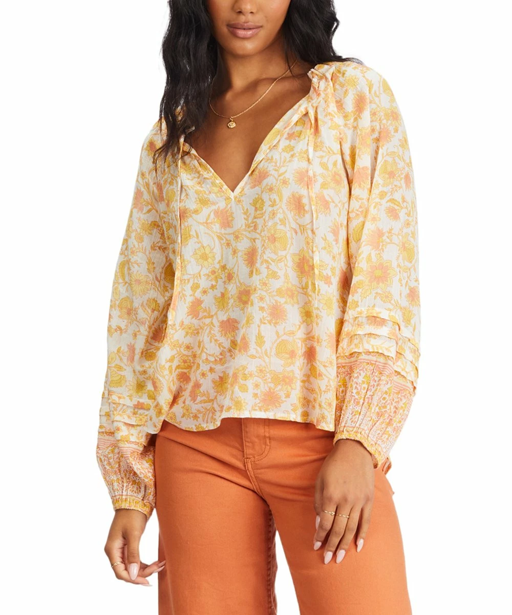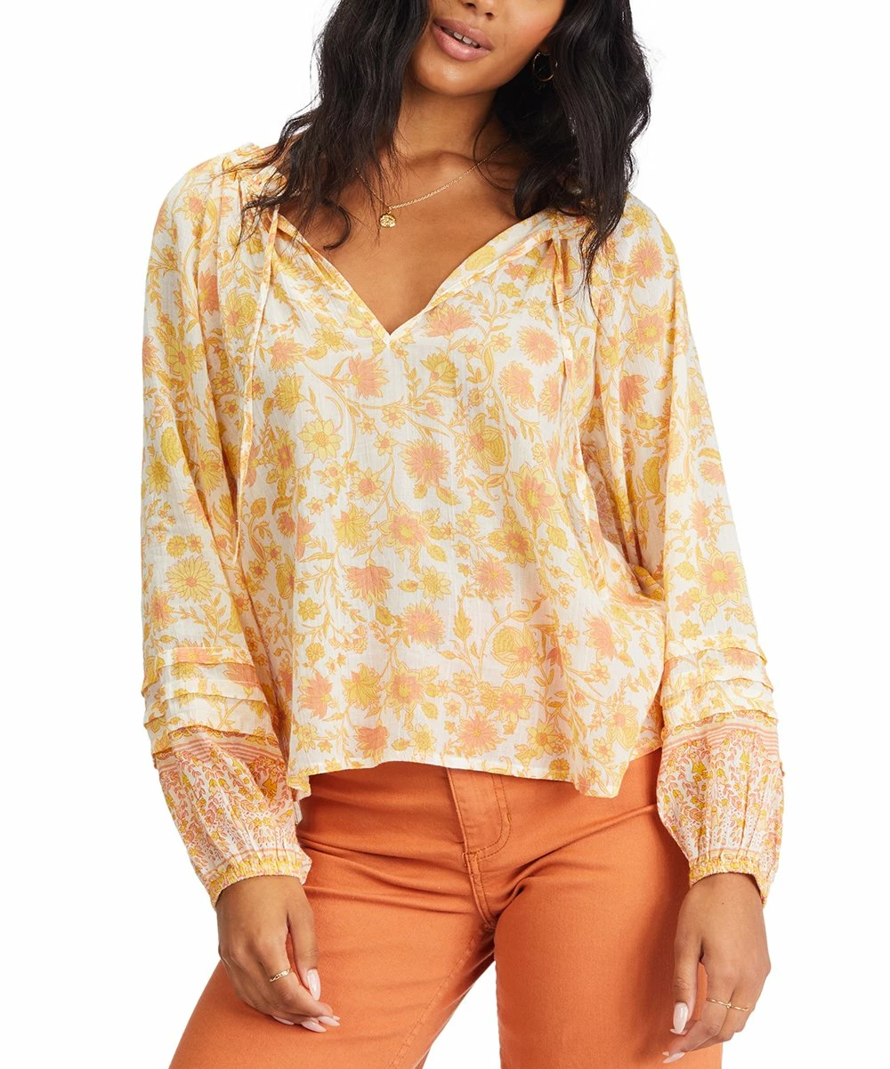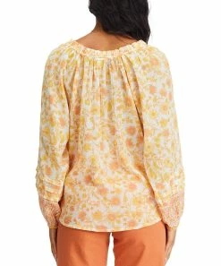 Long-sleeve blouse with an eye-catching pattern and a flattering V-neckline.