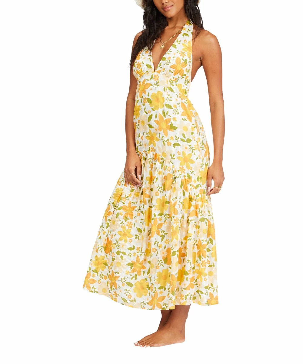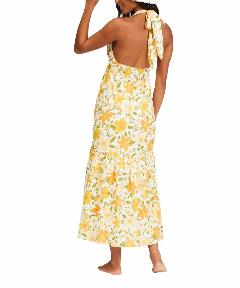 Made from breathable cotton, this bright dress pairs a sleeveless halterneck top with a deep V neckline and a lightly ruffled skirt for effortless and laid-back style.