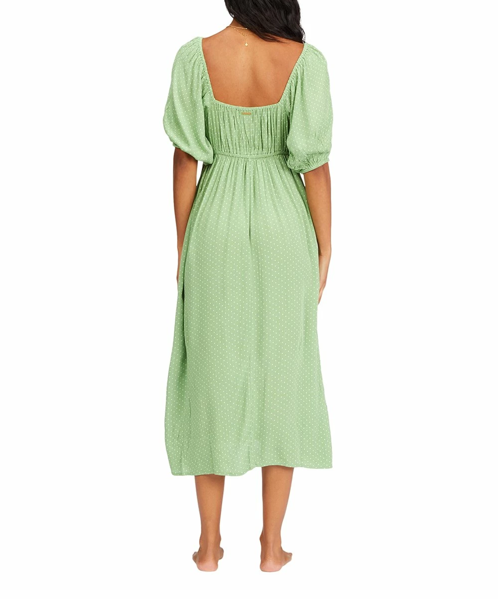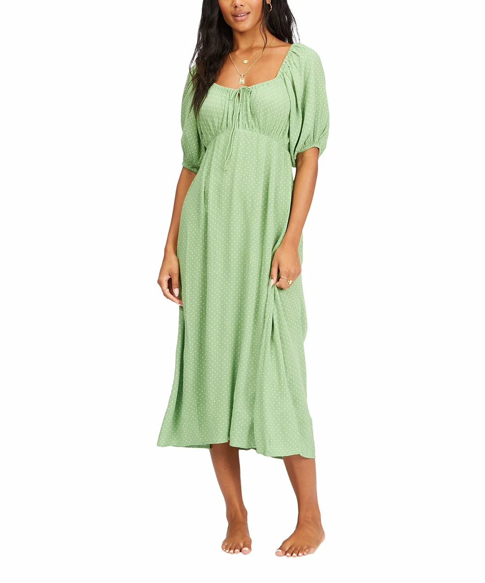 A flowy midi dress with a form-fitting empire waist and a flattering V-neckline.