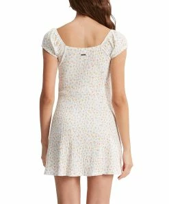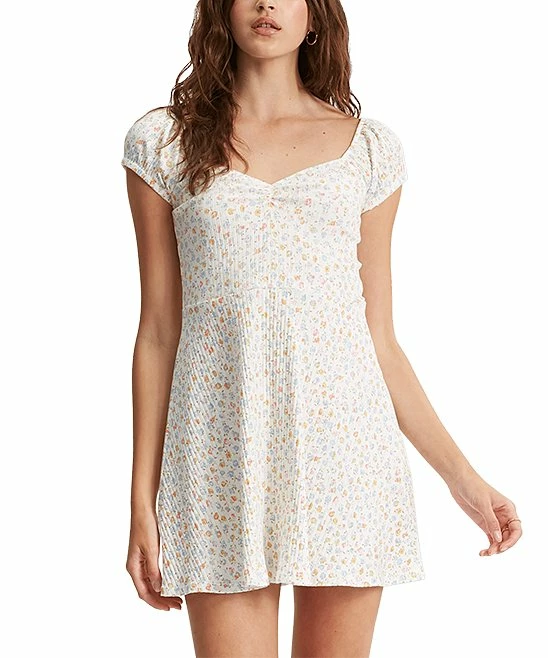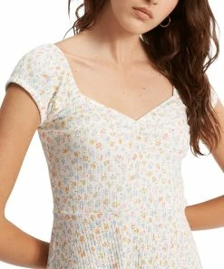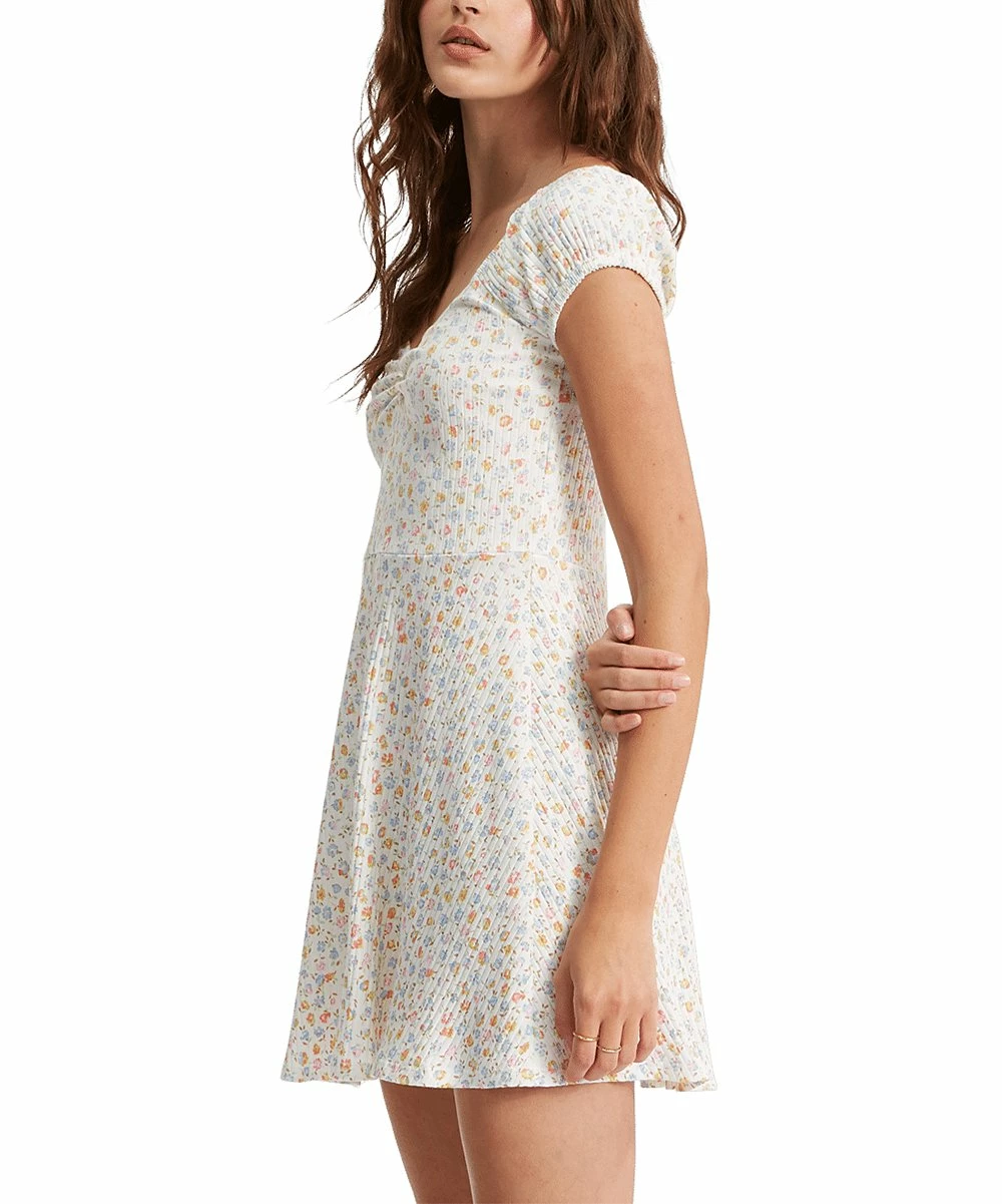 A sweetheart neckline adorns this cap-sleeve dress made from cotton material with a hint of stretch. Fit-and-flare styling.