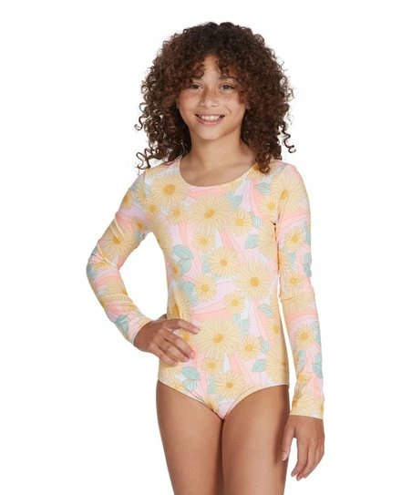They’ll be beach-ready in this one-peice designed with a floral print and long sleeves.